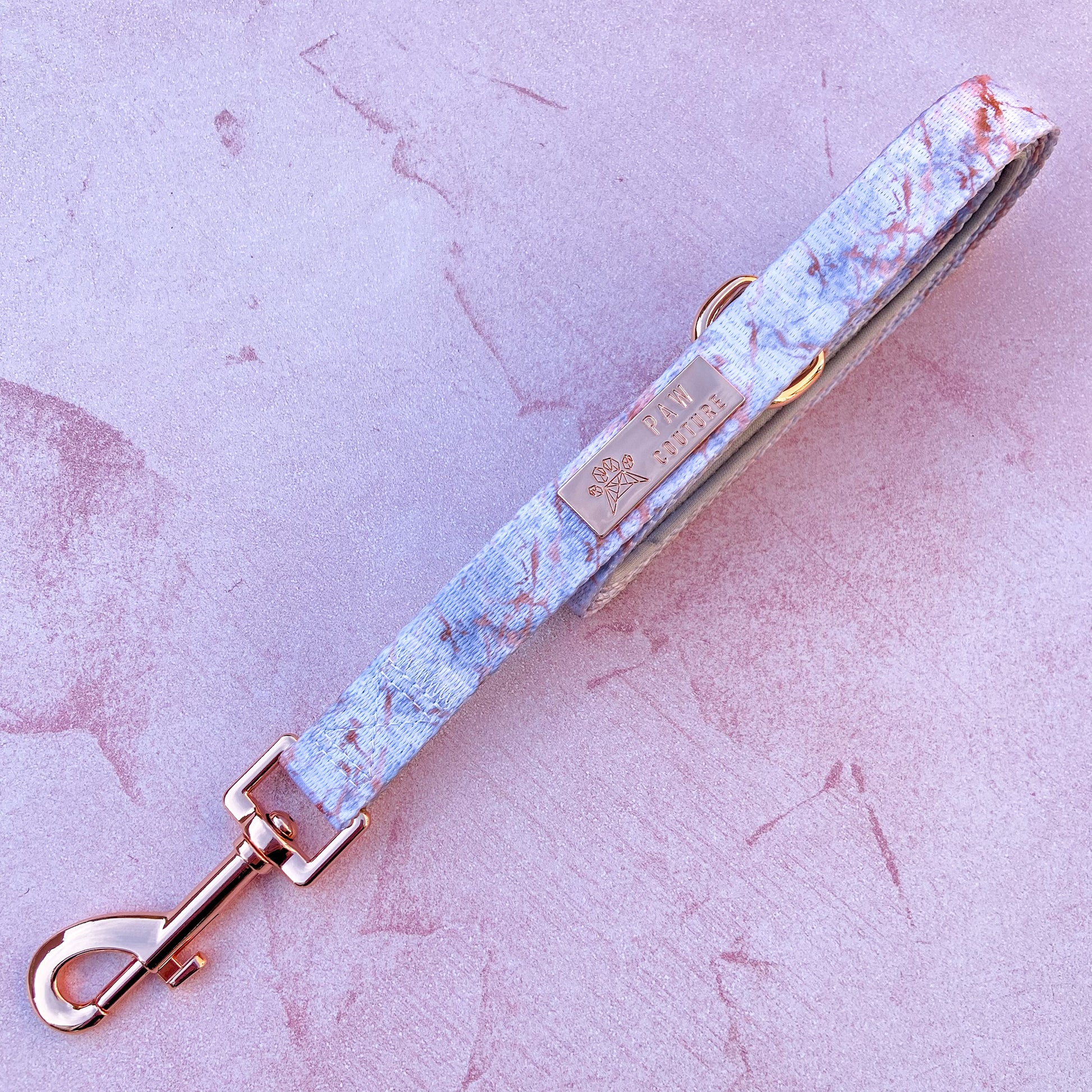 Featuring delicate light grey marbling with a rose gold vein effect and complimented by rose gold hardware makes this a super feminine and luxury design.